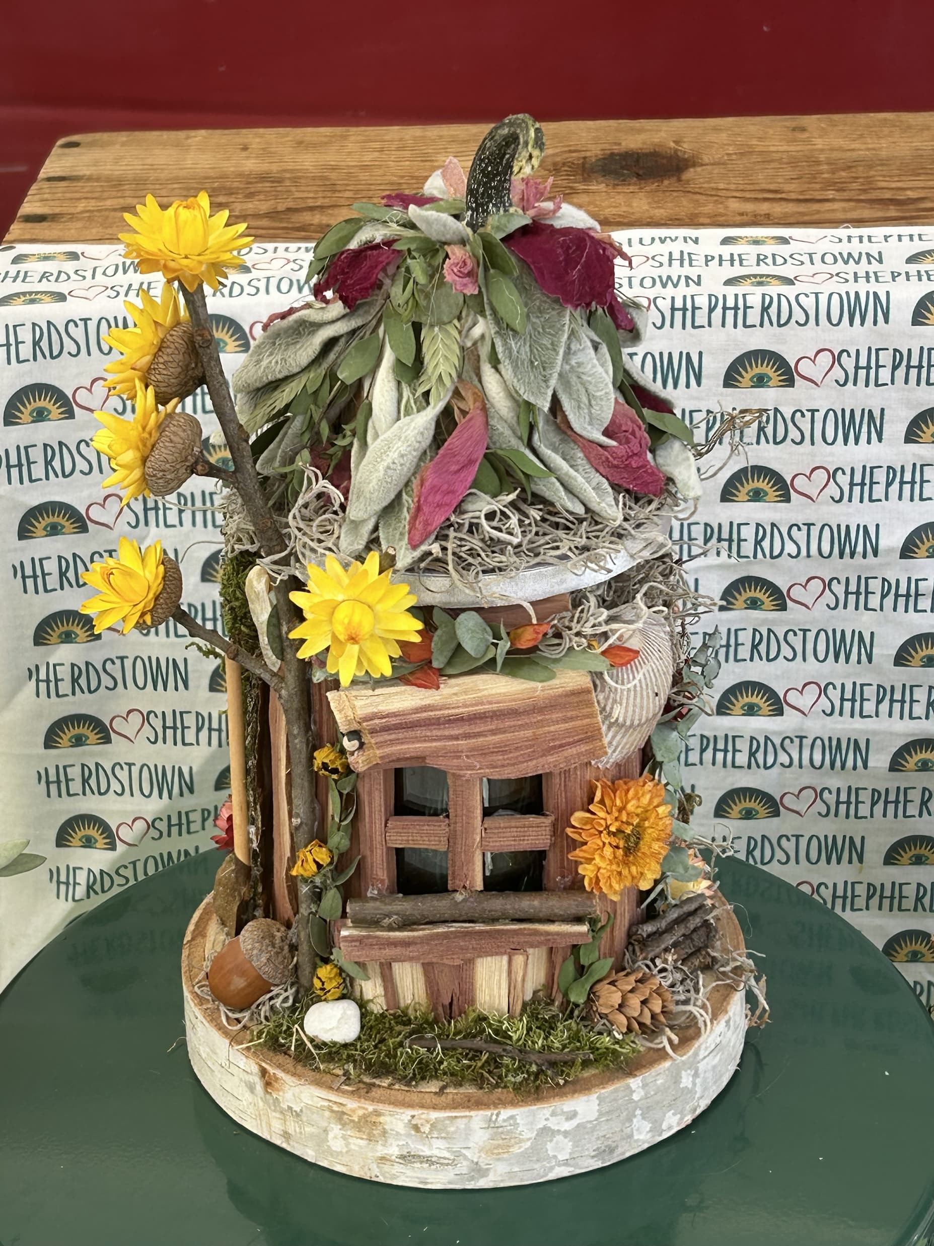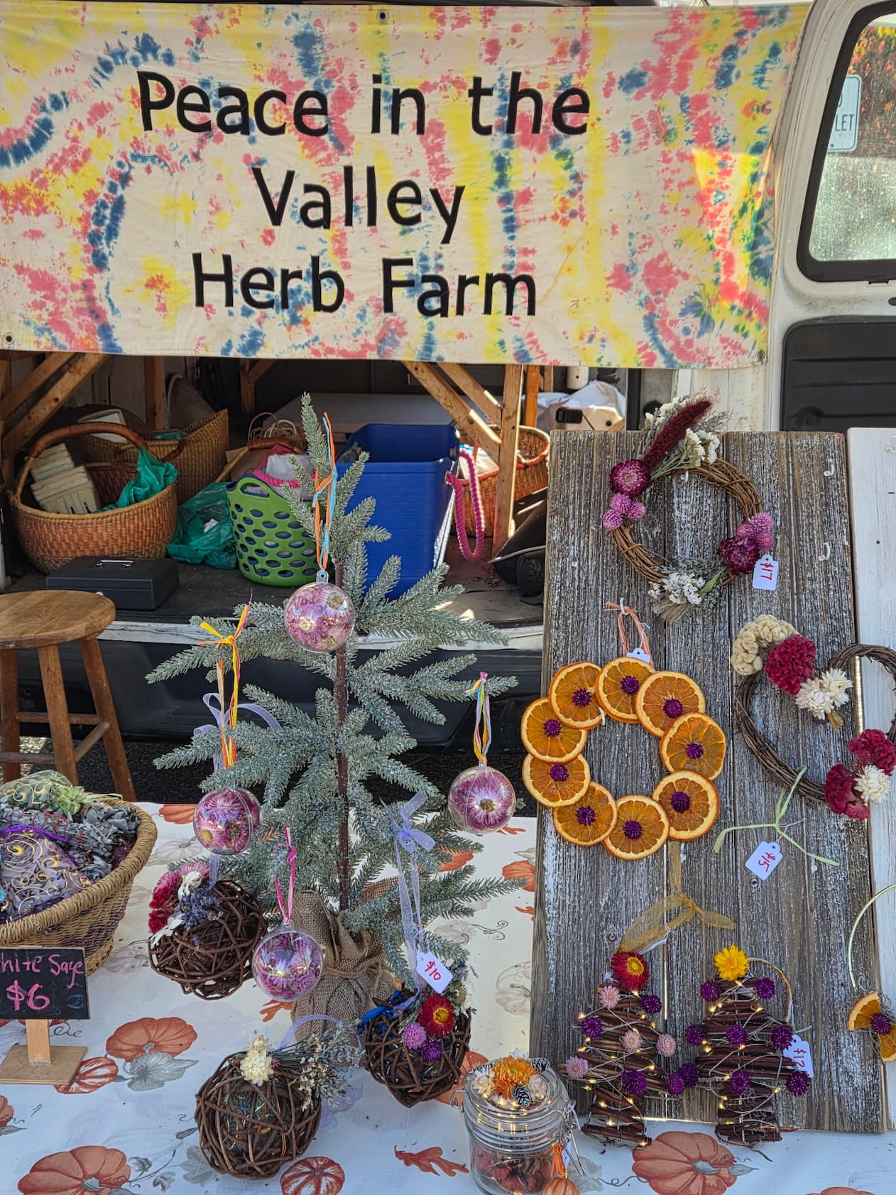 Peace in the Valley, CindyCulinary and medicinal herb plants, succulents, dried flower wreaths, decorated pumpkins, white sage, calendula salve and dried lavender.
