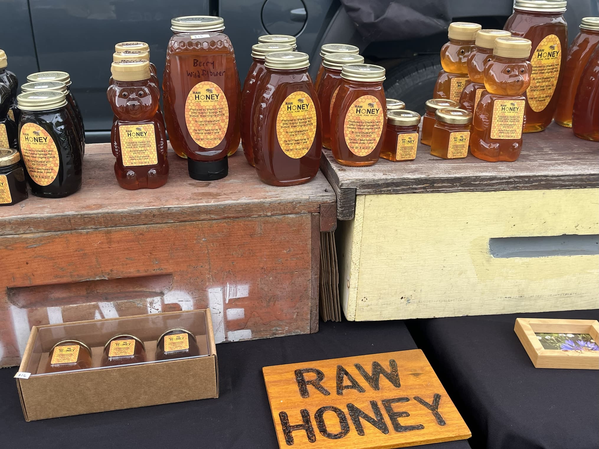 Shade's Farm, Beekeeper CurtHoney and Beeswax candles.